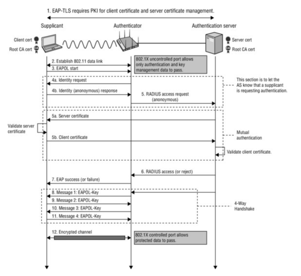 EAP-TLS is considered one of the most secure frameworks for authentication. The high security comes from the requirement of using client-side certificates and maintaining Public Key Infrastructure (PKI) which contains the certificates. An overview of frame exchanges are shown in the picture below